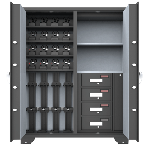 智能槍柜本系統(tǒng)利用人體指紋、人體掌靜脈的唯一性和終身不變性并結(jié)合手指、手掌靜脈的活體特征指標(biāo),對槍彈管理人員、持槍人及主管領(lǐng)導(dǎo)進(jìn)行身份鑒別,自動控制槍彈庫庫門、槍柜柜門、彈藥柜柜門的開啟,完全避免了使用鑰匙、密碼等傳統(tǒng)方法所存在的弊端。